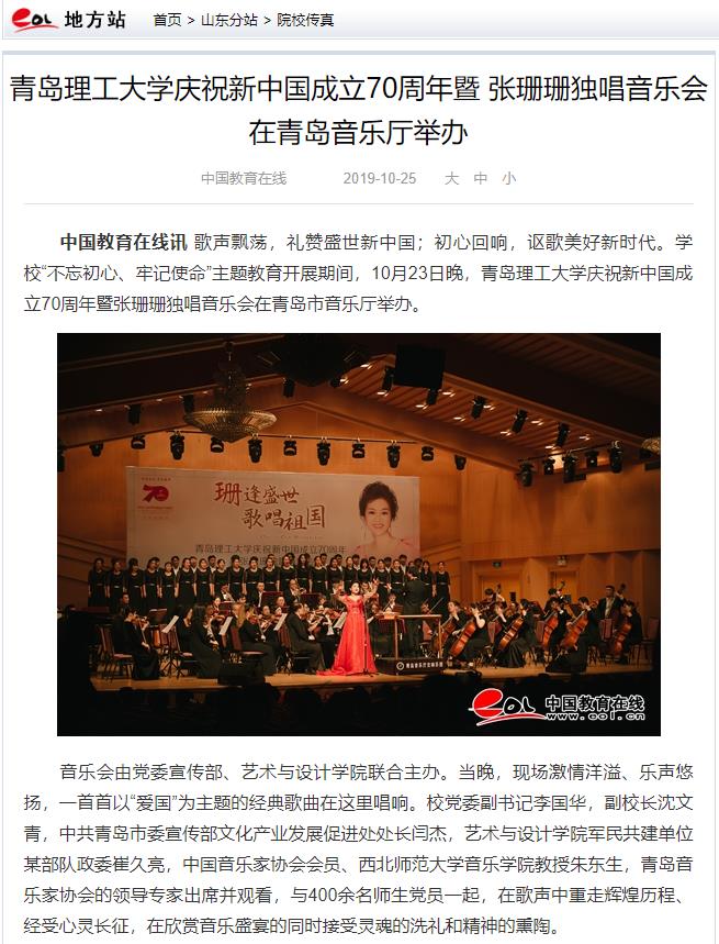 中国教育在线讯歌声飘荡,礼赞盛世新中国;初心回响,讴歌美好新时代。公司“不忘初心、牢记使命”主题教育开展期间,10月23日晚,williamhill官网网站庆祝新中国成立70周年暨张珊珊独唱音乐会在青岛市音乐厅举办。