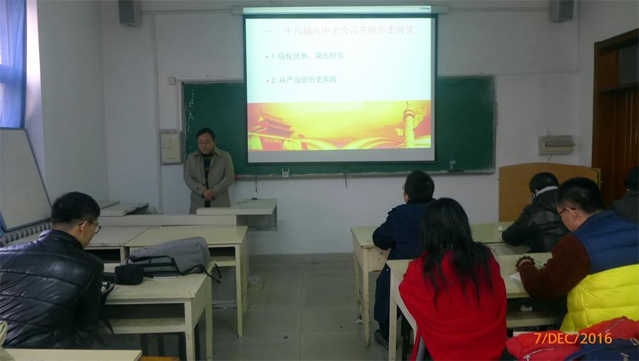 在党课的讲授过程中,王旭老师结合多年党校教学工作的经验和自己丰富的法律专业知识,首先从马克思主义哲学的角度分析解读了十八届六中全会召开的历史背景:“强化忧患、突出但当”:阐明了我党肩负的历史使命,面临的“四大考验”、“四种危险”以及我党从严治党的历史实践。其次王旭生动准确的将十八届六中全会的主要内容概括为“123456”,即一个领导核心、两部党内法规、三项党的决议、完善“四个全面”战略布局、“五位一体”制度体系、“六个系列”12各方面的要求和规定,有利于党员同志今后的学习贯彻执行。最后王旭老师从党的思想建设、党的组织建设、党风、党的反腐倡廉建设、党的制度建设的全局性、根本性、长期性以及以上率下、整体推进六个方面与在座党员分享了自己学习十八届六中全会精神的体会。
