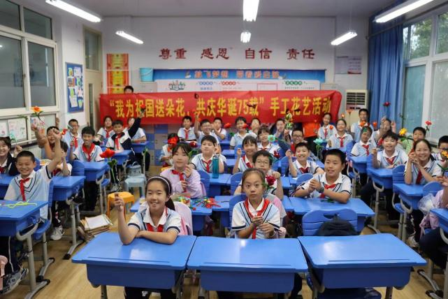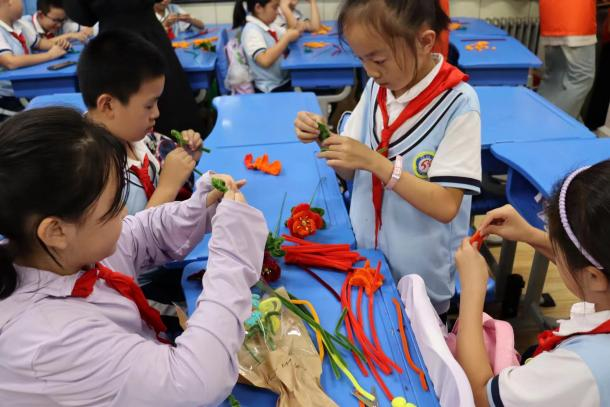 编织献真情。古韵今风,非遗续章。9月30日,公司志愿服务中心成员们前往青岛市第五十三中学小学部,组织开展了一场别开生面的“我为祖国送朵花,共庆华诞75载”老员工进校园手工花艺活动。志愿者们通过制作视频,讲解课件等方式,在讲述国庆节由来与历史的同时,带领小员工们学习手工编织花的制作技巧。小员工们在志愿者的帮助下,运用手中的工具,使用扭、捆、粘等方式,借助柔软的扭扭棒,搭配独特艺术视角和纯真诚挚的爱国之心,纷纷制作出独具新意与心意的手编花束,每一束都蕴含着新时代青少年们对祖国的深深热爱与美好祝愿。