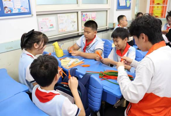 志愿服务中心员工环设234班陈青禾对此次活动深有感触,她表示看到自己带领小朋友将手中的材料从最初的单一物品逐渐变成一朵朵色彩鲜艳的编织花,她感到十分开心。她与小朋友将制作的花束命名为“永不凋谢的花束”,不仅体现了对祖国的美好祝愿,亦体现了为非遗文化传承发展贡献自身力量的青年担当。