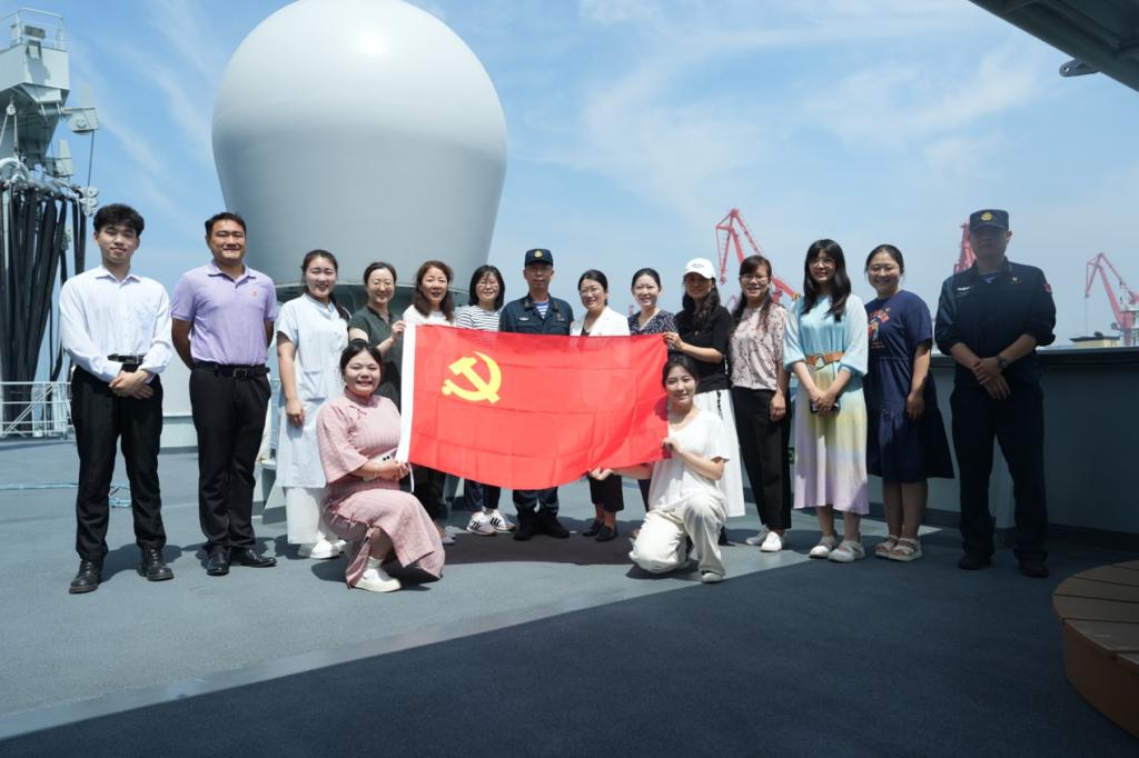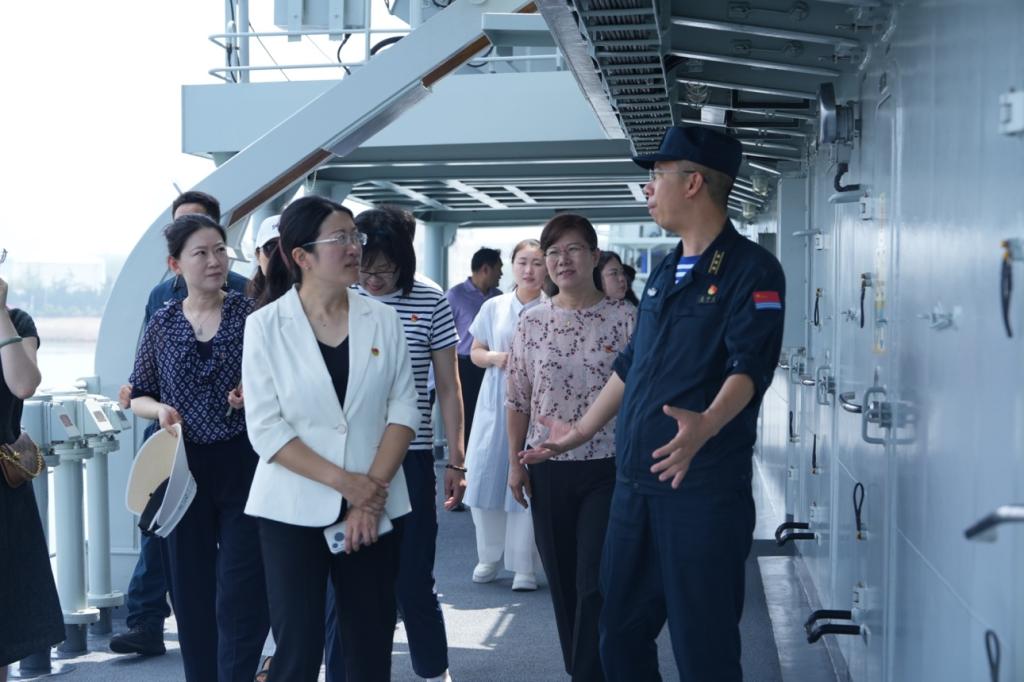 走出会议室,师生党员代表饱览现役舰艇的雄伟风采。在舰领导的陪同讲解下,师生党员近距离接触驾驶室、手术室、阅览室等船舱内部设备装置,深切领会新时代海军“向战而行向海图强”的精神要义与战略内涵。