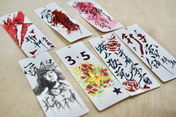 活动现场,艺院学子们发挥自己的创意和想象力,用精美的图案和满怀着传承雷锋精神的艺术精神绘制出了一幅幅充满着艺术美感以及志愿精神的团扇。参与团扇制作的同学表示:“这些团扇不仅寓意雷锋同志的故事历久弥新,更表达出的是雷锋同志的精神超越了时空的限制,我们会努力的做好这场中华民族伟大复兴的接力跑!”。同时还有部分同学在书签上写下雷锋精神的名言警句,这些书签在同学们的笔墨创新下成为了传递雷锋精神的艺术载体和有力工具。