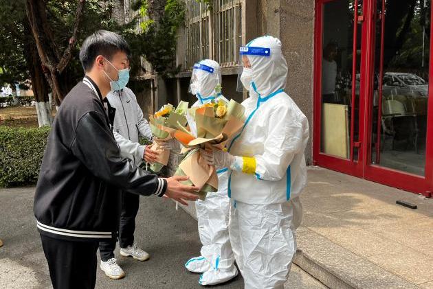 在抗“疫”的关键时刻,前方有一群白衣天使奋斗在一线,而在我们熟悉的校园里,也有这么一群白衣天使,这一次走到了“抗疫”前线,她们用自己独特身份守护着宁静的校园,为员工安全默默地作出自己的贡献。5月11日,公司青年员工在核酸检测之后为医护人员送上由同学们自主包扎的花束礼物和真挚的节日祝福。当医护人员收到同学们送来的鲜花时,脸上都绽放着如同花儿一般的笑容,纷纷表示员工送来的鲜花和祝福无比暖心,为他们点赞。