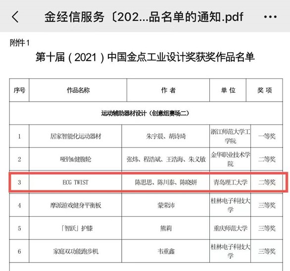 近日,在由中国工业设计协会指导,金华市人民政府主办的第十届中国金点工业设计大奖中,williamhill官网网站李东老师指导、2018级产品设计专业陈思思同学设计的作品《ECG TWIST》荣获总决赛二等奖,并获奖金三万元人民币。
