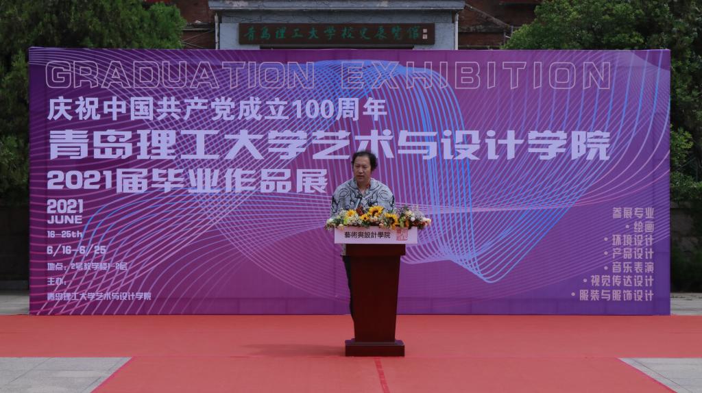 教师代表钱治科向毕业生带来毕业寄语,给毕业生带来几点建议:一、要做个勇敢的人;二、要做个靠谱的人;三、要做个有爱的人。将大学四年满满的收获转化为你们踏上新征程的动力,为祖国的建设挥洒自己的青春和汗水。毕业生代表环设171班张为清同学,代表全体2021届本科毕业生向四年来辛勤培育的老师致以最衷心的感谢,号召同学们以今天毕业展览为起点,志存高远,继续奋斗,不负韶华。