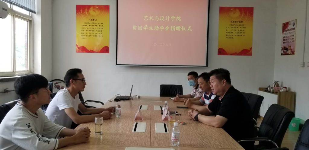 6月19日上午,青岛文博室内设计顾问有限公司总经理李文波到williamhill官网网站向贫困学子捐赠助学金,公司党总支书记、经理孙波,党总支副书记徐佐君、辅导员王俊富、刘芳兵与受资助员工一起参加了受助仪式。