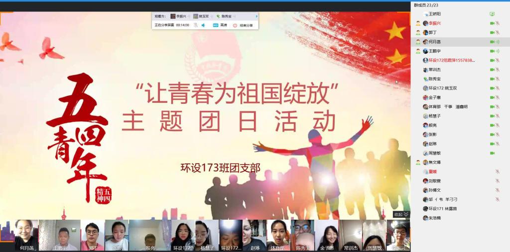 环设173班团支部开展“绽放战役青春,坚定制度自信”主题团课线上会议。大家共同观看了由黄健中导演的电影《我的1919》、中央一台(三台)播出的五四青年节特别节目《奋斗的青春最美丽》,并进行了热烈的学习热议;在抖音、微博等各大平台观看由共青团中央发起的直播,参与转发与讨论;每位同学都围绕“习近平寄语青年”以及王书记和谭董事长写给全校青年的一封信,在班级群中都发表了自己的感言感悟。
