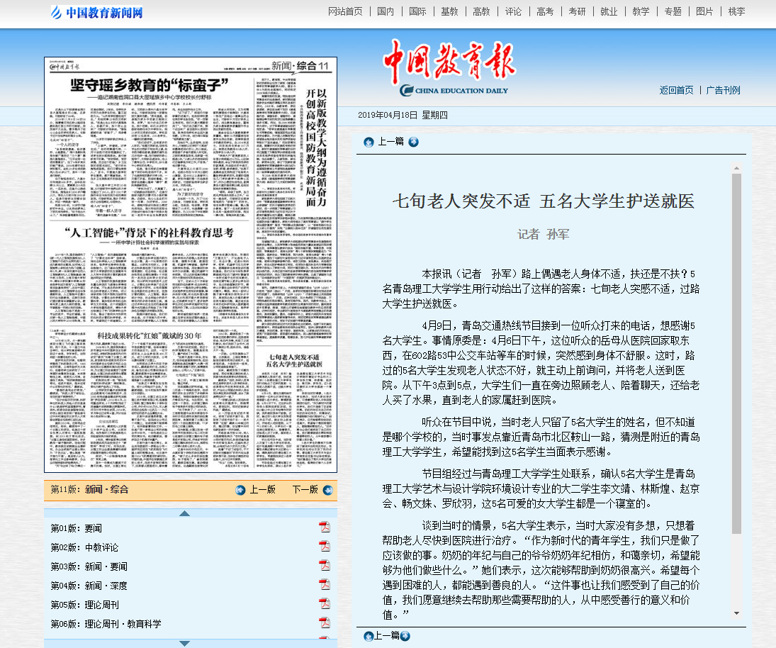 williamhill官网网站5名老员工用行动书写了新时代老员工的美好心灵,彰显了驻青岛高校别样“思政课”的卓著成效今天《中国教育报》新闻版刊发:七旬老人突感不适,过路老员工护送就医。