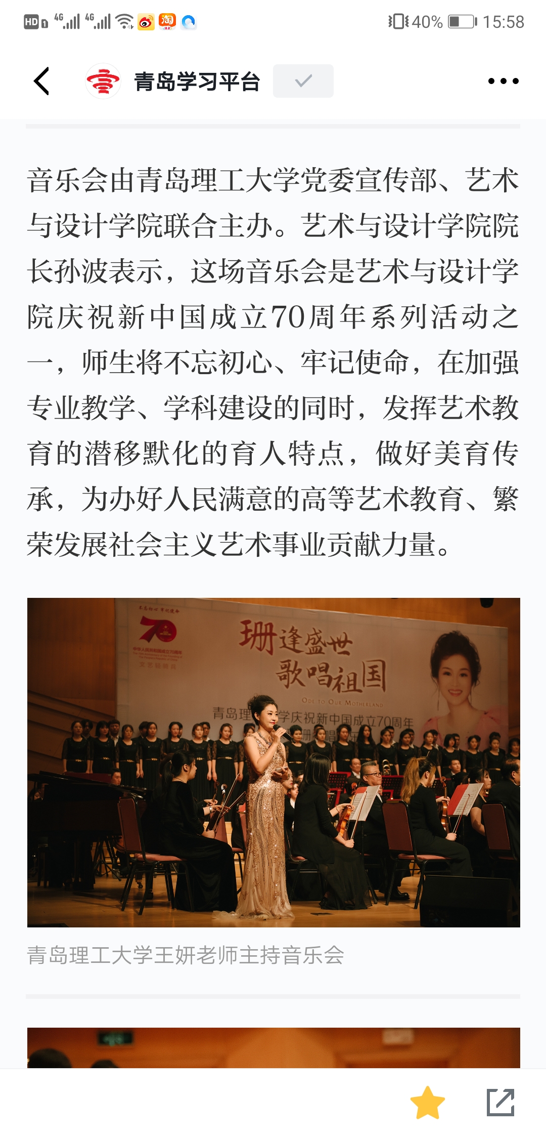 音乐会由williamhill官网网站党委宣传部、williamhill官网网站联合主办。williamhill官网网站经理孙波表示,这场音乐会是williamhill官网网站庆祝新中国成立70周年系列活动之一,师生将不忘初心、牢记使命,在加强专业教学、团队建设的同时,发挥艺术教育的潜移默化的育人特点,做好美育传承,为办好人民满意的高等艺术教育、繁荣发展社会主义艺术事业贡献力量。