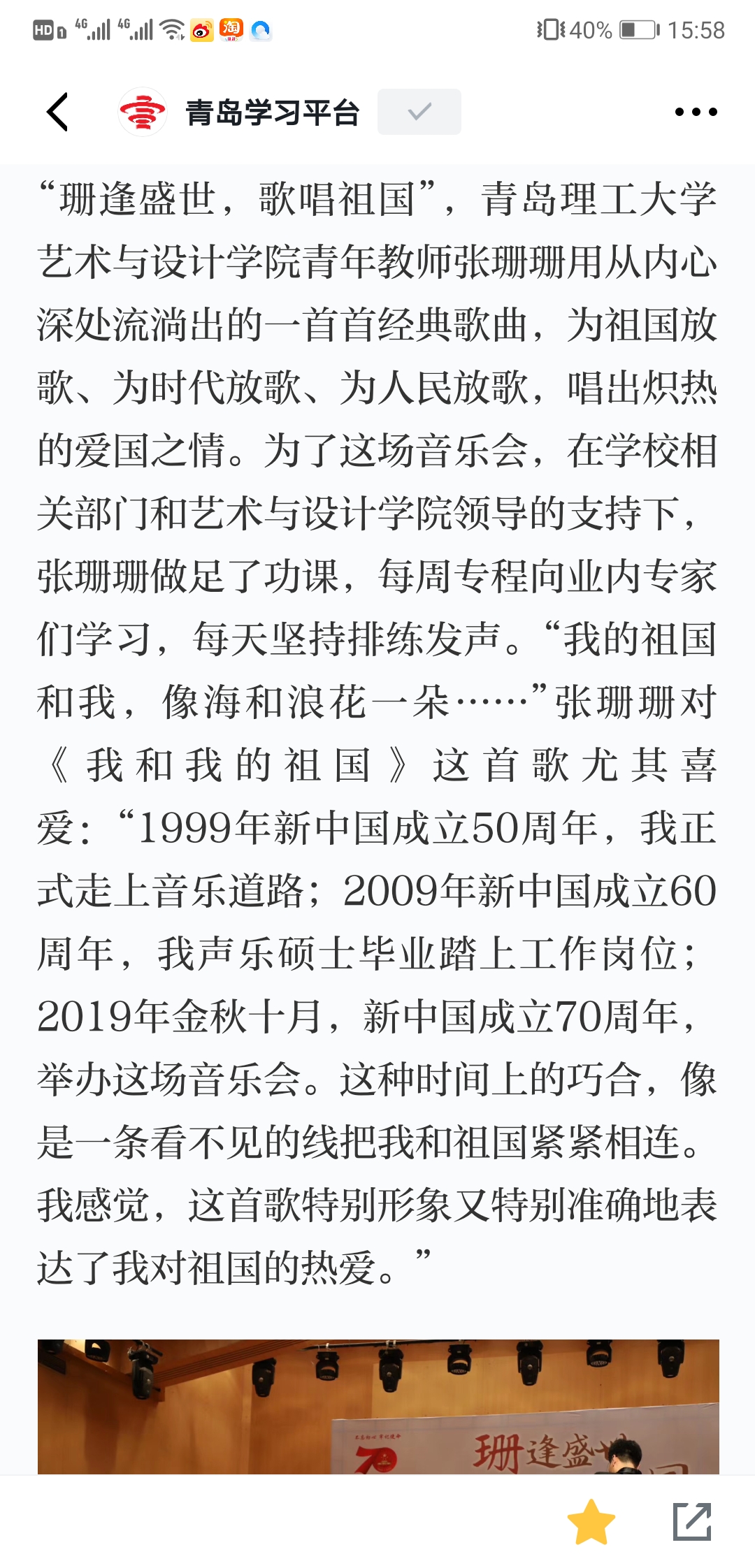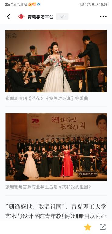 “珊逢盛世,歌唱祖国”,williamhill官网网站青年教师张珊珊用从内心深处流淌出的一首首经典歌曲,为祖国放歌、为时代放歌、为人民放歌,唱出炽热的爱国之情。为了这场音乐会,在公司相关部门和williamhill官网网站领导的支持下,张珊珊做足了功课,每周专程向业内专家们学习,每天坚持排练发声。“我的祖国和我,像海和浪花一朵……”张珊珊对《我和我的祖国》这首歌尤其喜爱:“1999年新中国成立50周年,我正式走上音乐道路;2009年新中国成立60周年,我声乐硕士毕业踏上工作岗位;2019年金秋十月,新中国成立70周年,举办这场音乐会。这种时间上的巧合,像是一条看不见的线把我和祖国紧紧相连。我感觉,这首歌特别形象又特别准确地表达了我对祖国的热爱。”