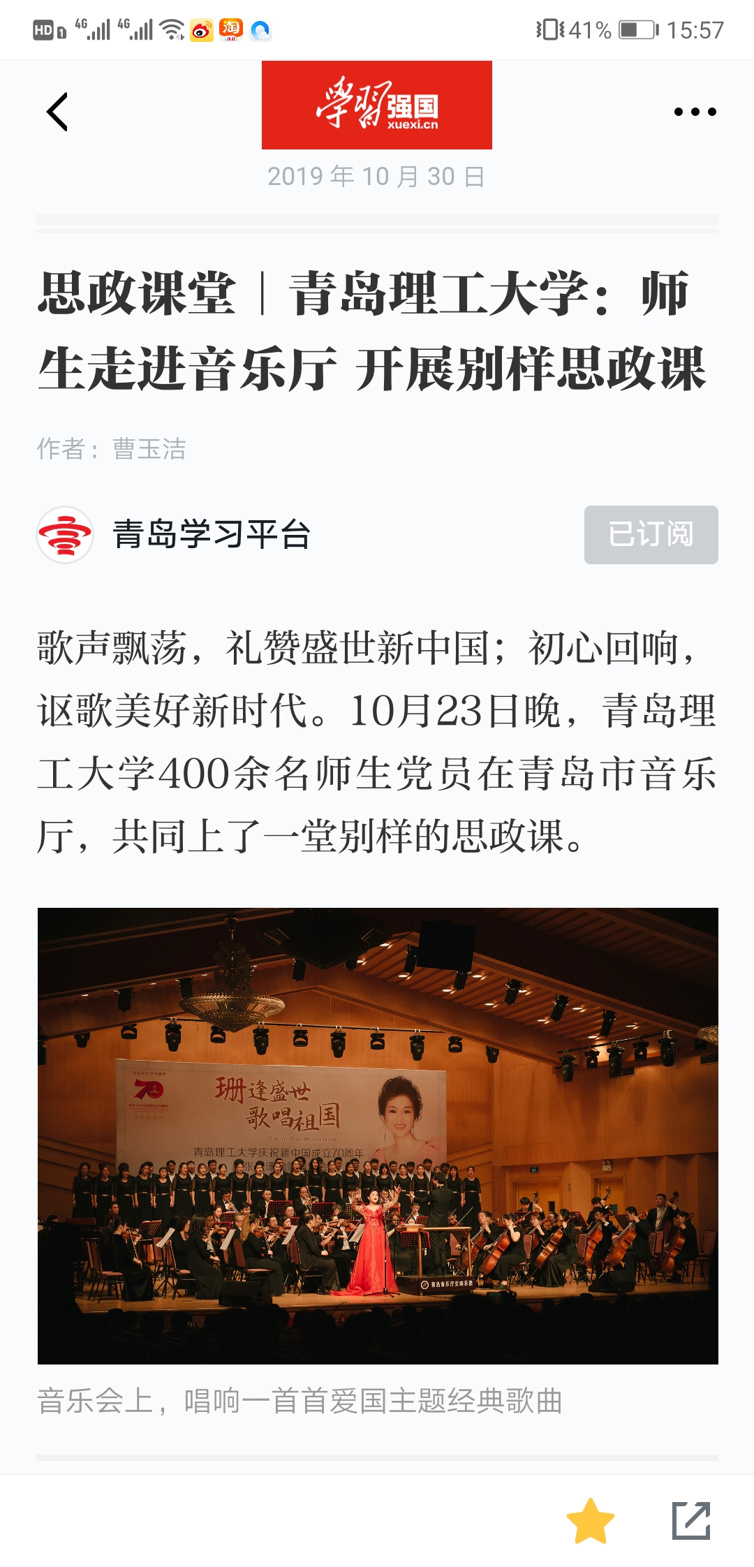歌声飘荡,礼赞盛世新中国;初心回响,讴歌美好新时代。10月23日晚,williamhill官网网站400余名师生党员在青岛市音乐厅,共同上了一堂别样的思政课。