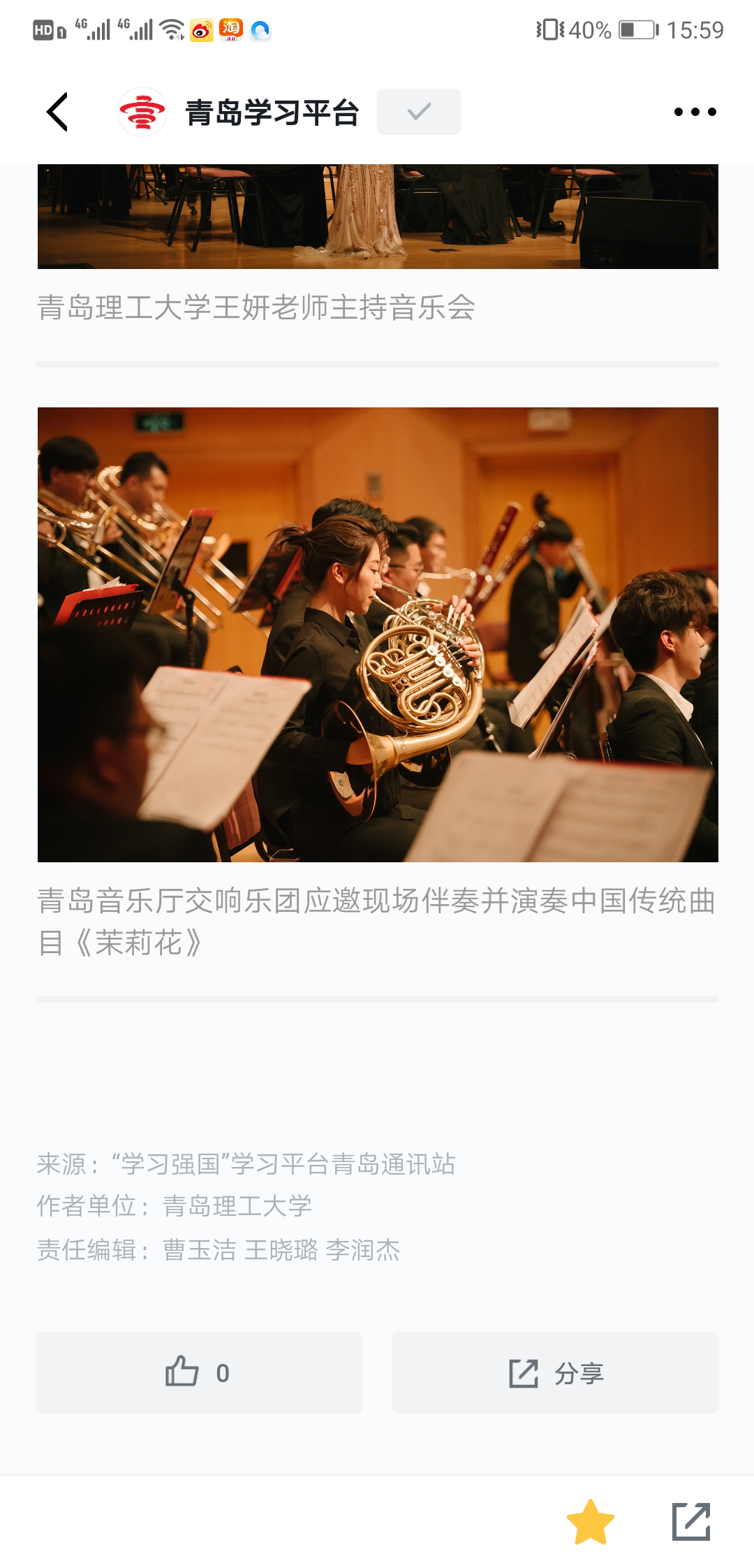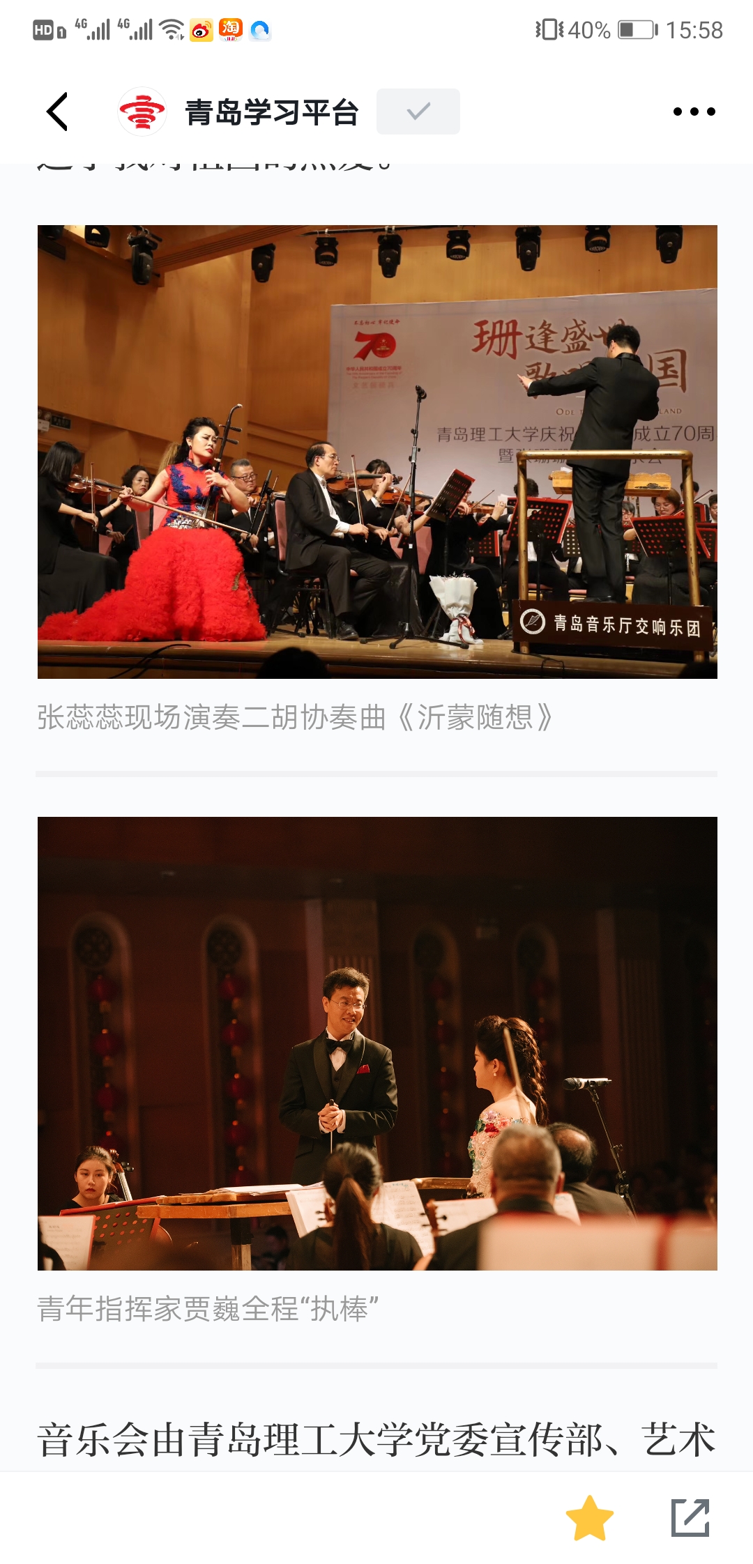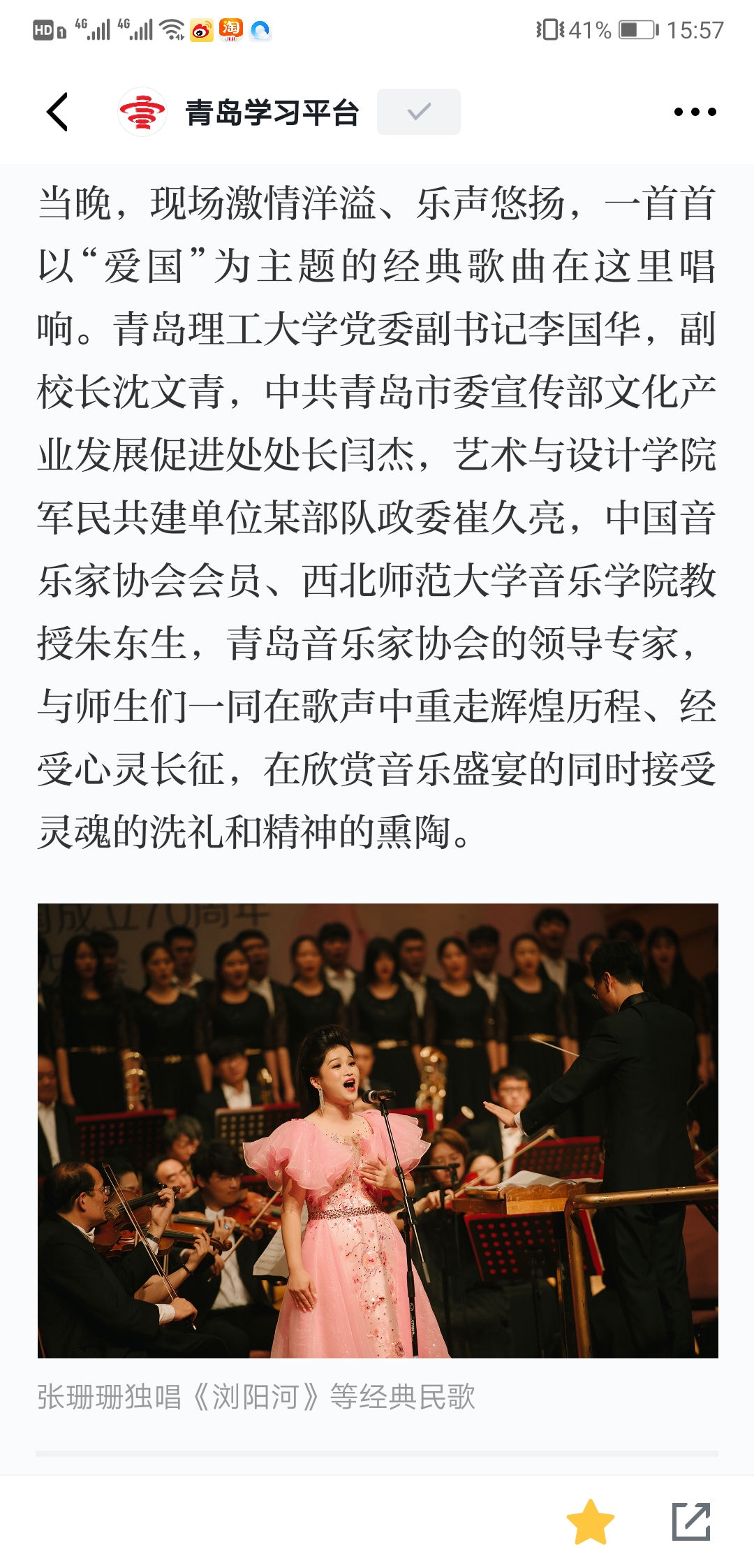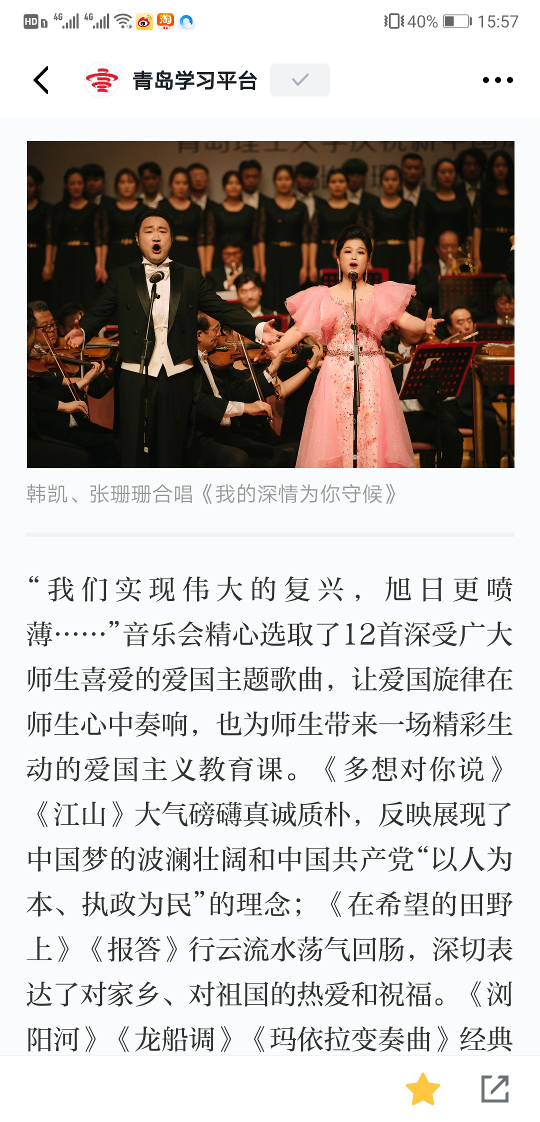 “我们实现伟大的复兴,旭日更喷薄……”音乐会精心选取了12首深受广大师生喜爱的爱国主题歌曲,让爱国旋律在师生心中奏响,也为师生带来一场精彩生动的爱国主义教育课。《多想对你说》《江山》大气磅礴真诚质朴,反映展现了中国梦的波澜壮阔和中国共产党“以人为本、执政为民”的理念;《在希望的田野上》《报答》行云流水荡气回肠,深切表达了对家乡、对祖国的热爱和祝福。《浏阳河》《龙船调》《玛依拉变奏曲》经典民歌脍炙人口,《芦花》《玫瑰三愿》意境深远委婉动听,《我的深情为你守候》《我的爱将与你相伴终生》深沉执着隽永动人,从不同侧面歌颂伟大祖国的大好河山,歌颂新时代春潮涌动的蓬勃景象。作为演出嘉宾,williamhill官网网站青年教师张蕊蕊现场演奏二胡协奏曲《沂蒙随想》,青年教师韩凯、张珊珊合唱了《我的深情为你守候》。青岛音乐厅交响乐团应邀现场伴奏并演奏中国传统曲目《茉莉花》,青年指挥家贾巍全程“执棒”,williamhill官网网站伯牙员工室内合唱团伴唱。音乐会在台上歌唱、台下应和的一首《我和我的祖国》中落下帷幕。